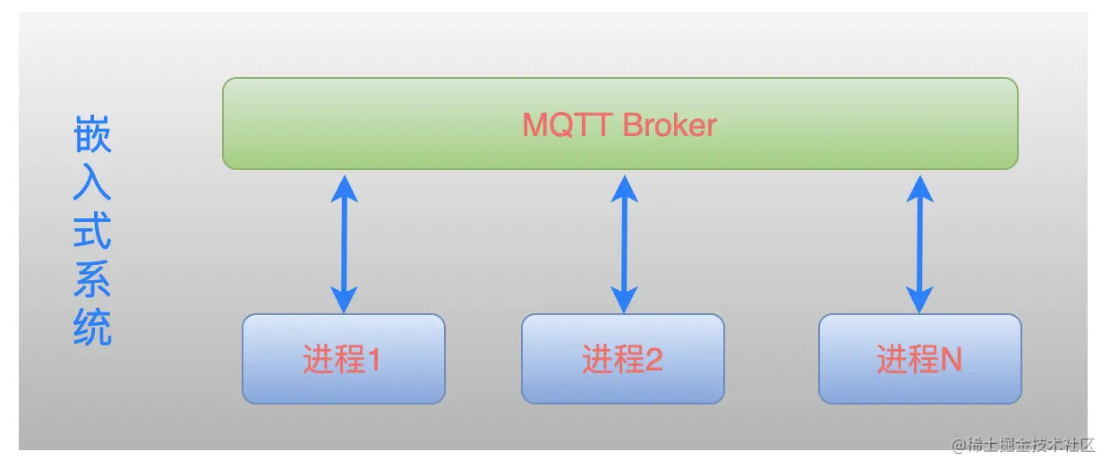 我们可以把这个机制应用在嵌入式应用程序的设计中:MQTT Broker 作为一个独立的服务运行在嵌入式系统本地,其他需要交互的进程,只要连接到本地的这个 Broker,就可以相互发送数据了。运行模型如下:
