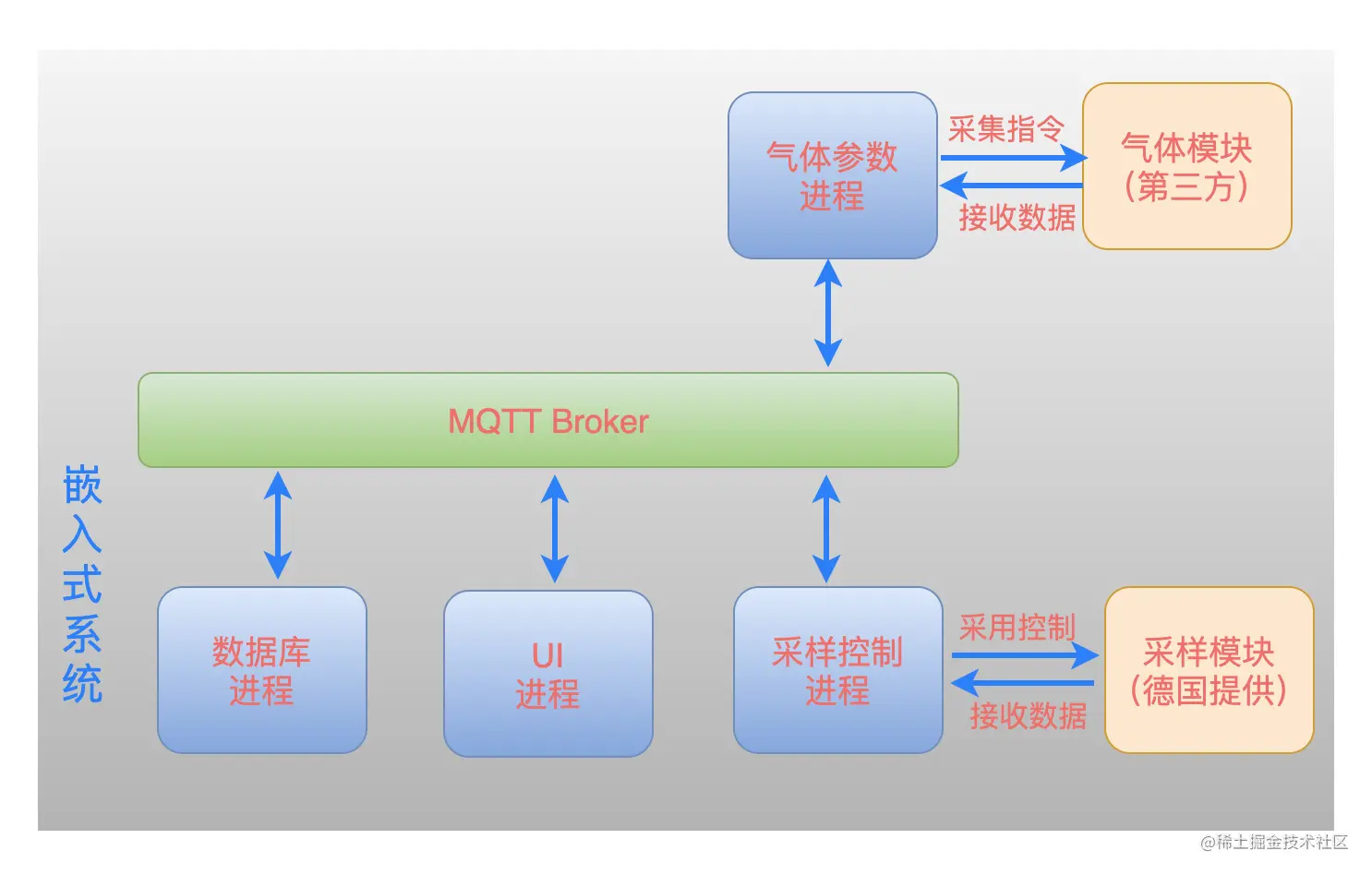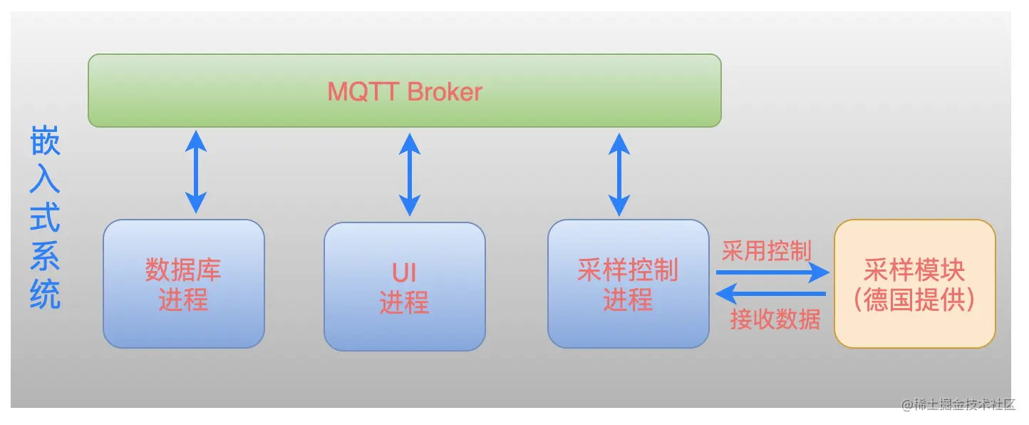 - UI 进程通过消息总线,发送控制指令给采样控制进程,采样控制进程接收到后通过串口发送控制指令给采样模块;