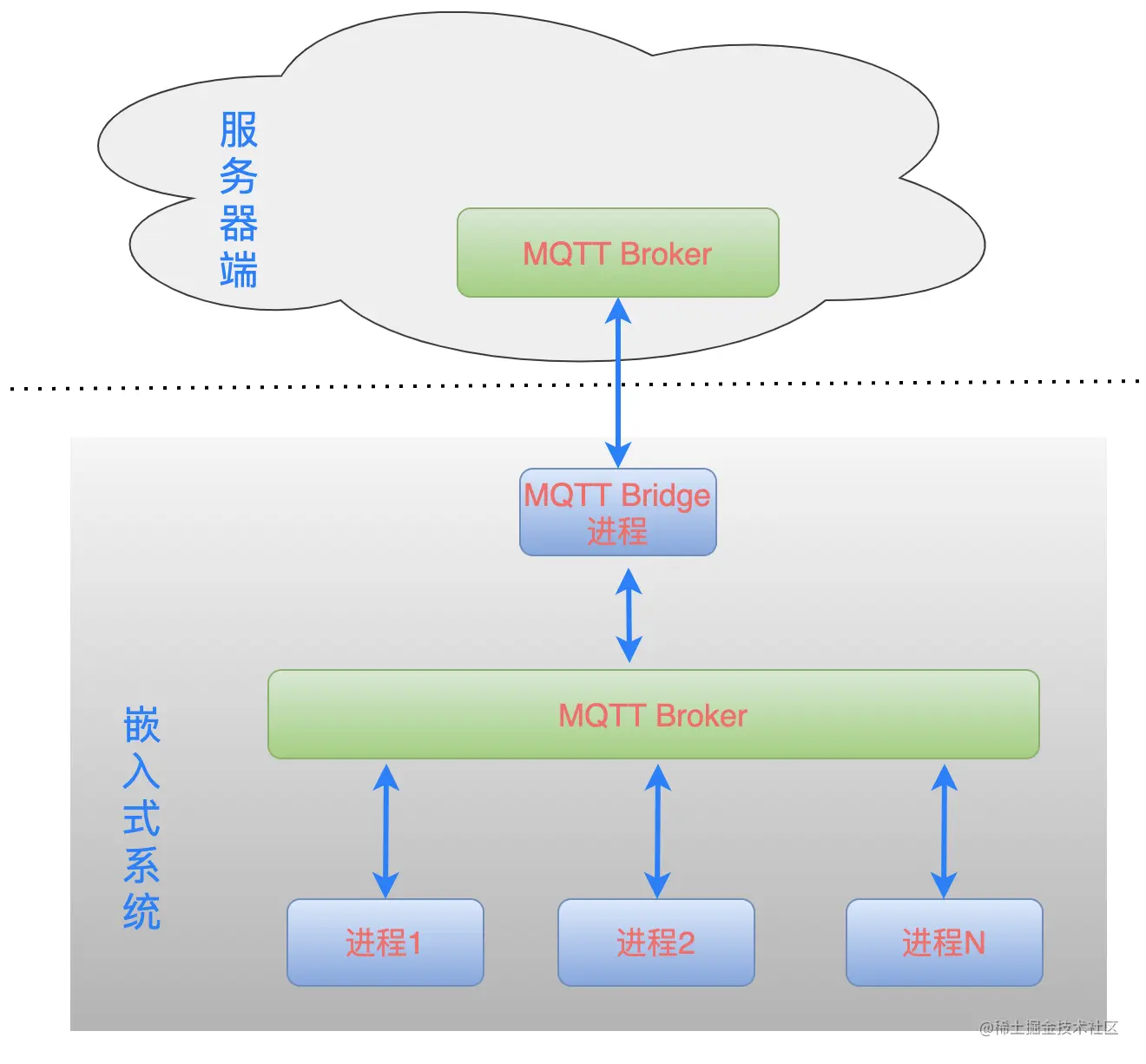 加入一个 MQTT Bridge 桥接模块即可!也就是再增加一个进程,这个进程同时连接到云端的 MQTT Broker 和本地的 MQTT Broker,通信模型如下: