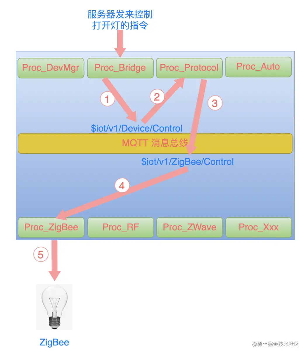 - Proc_Protocol 分析指令内容,发现是一个 ZigBee 设备,于是进行协议转换,发送一个 ZigBee 控制指令到消息总线上的 topic: $iot/v1/ZigBee/Control。