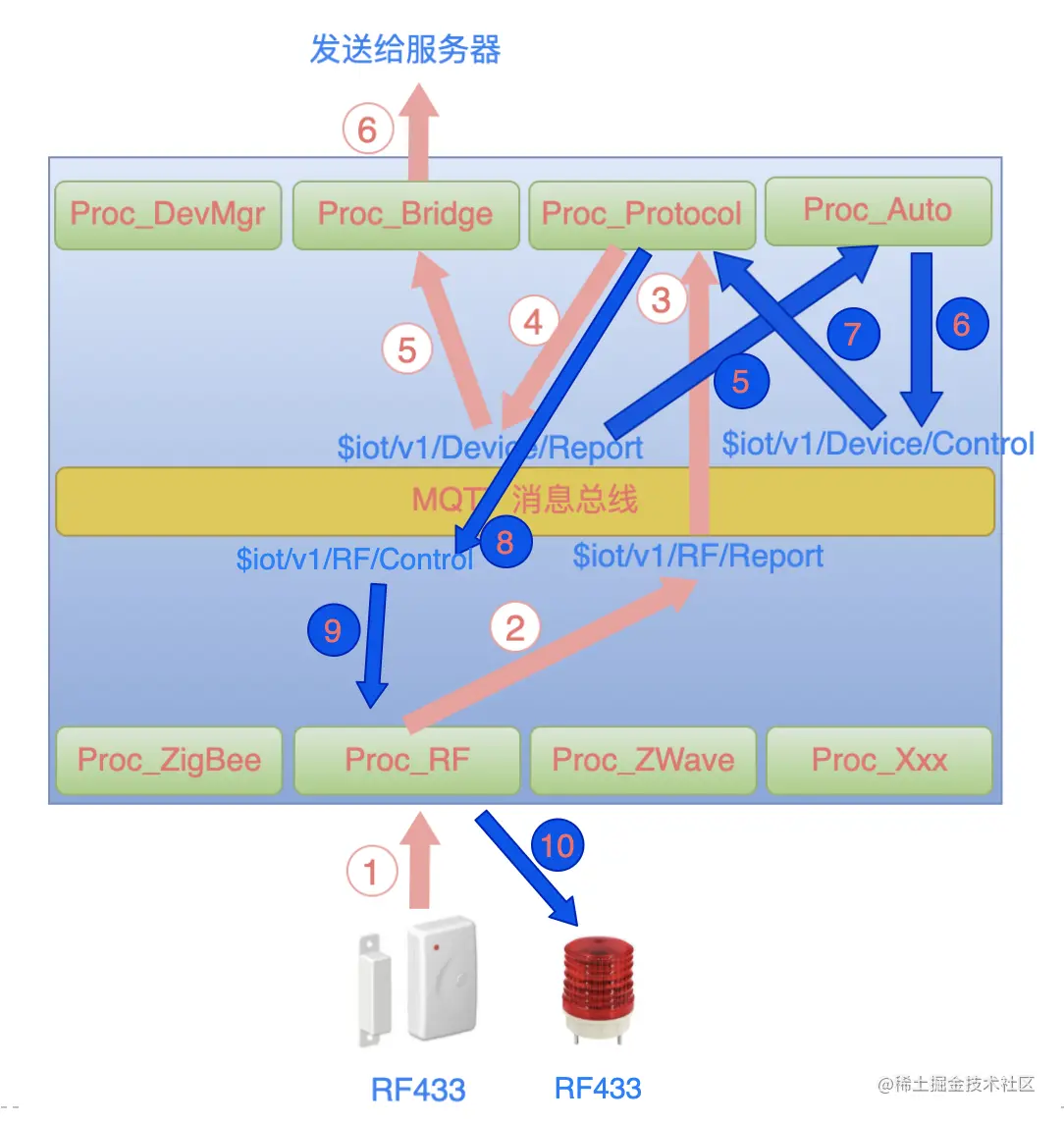 - Proc_RF 进程接收到 RF433 通信模块上报的数据,把“门磁打开”这个信息发送到消息总线上的 topic:$iot/v1/RF/Report。
