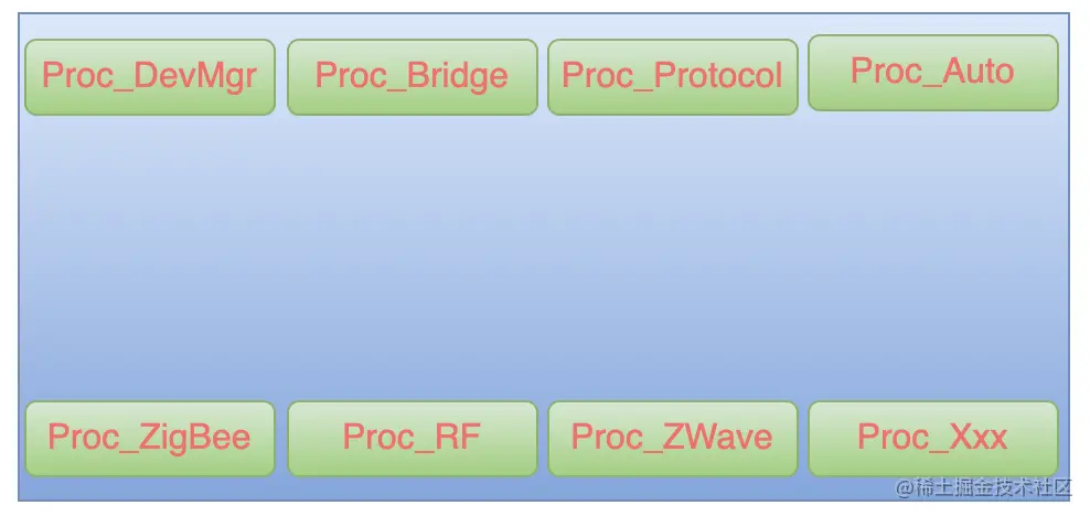 - 设备管理进程 Proc_DevMgr:当任何一种设备被添加到系统中时,都需要处进行处理,因此它需要与 Proc_ZigBee, Proc_RF, Proc_ZWave 这些进程进行通信;