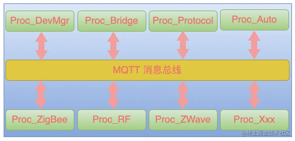 引入了 MQTT 消息总线之后,每个进程只需要挂载到总线上。每个进程只需要监听自己感兴趣的 topic,就可以接收到相应的数据。