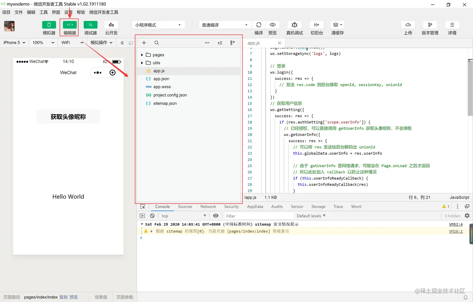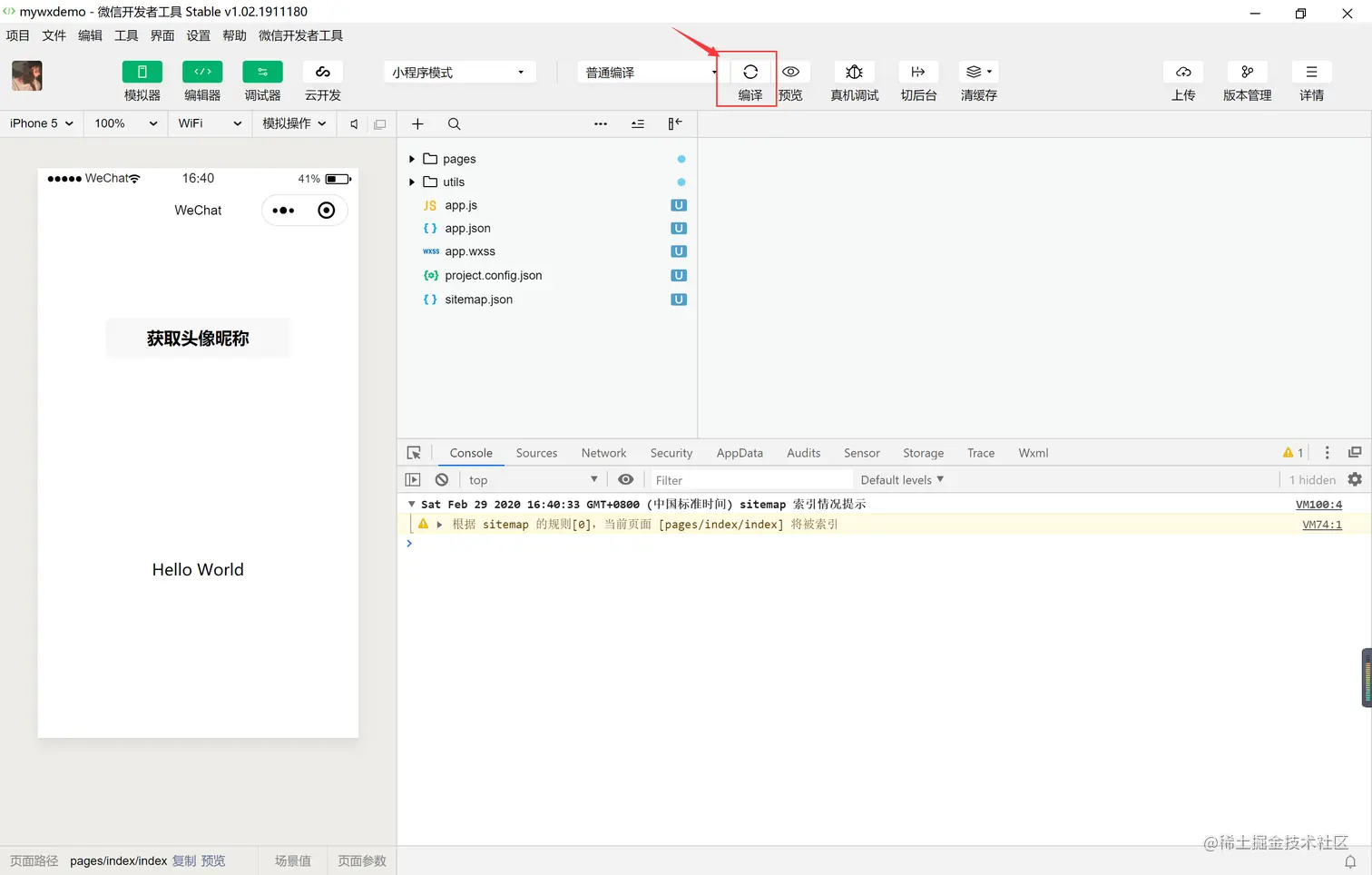 微信开发者工具的界面可以用于代码编写、代码调试、项目预览与上传、编译、前后台切换、缓存数据清理以及关闭项目。如图所示: