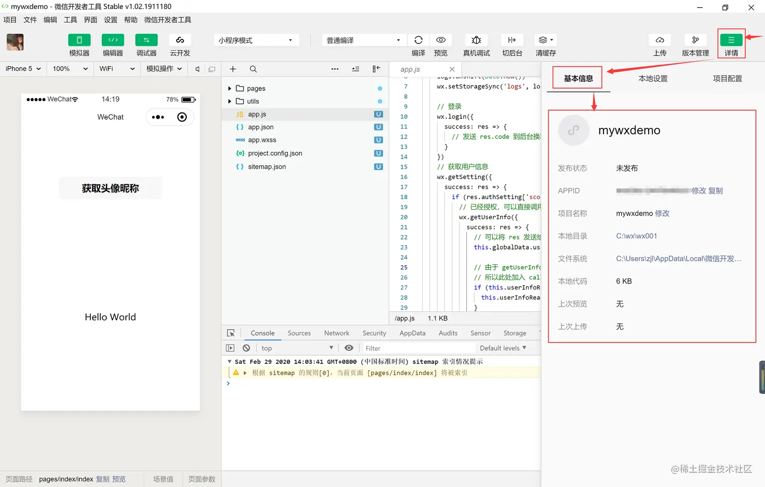 包括了项目名称、AppID、项目文件的路径,如果有AppID的项目,可以在微信上预览微信小程序。如下图所示: