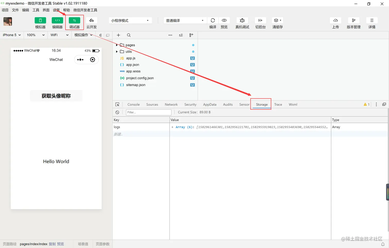 【4】Storage 用于显示当前项目使用 wx.setStorage 或 wx.setStorageSync 后地数据存储情况。如下图所示: