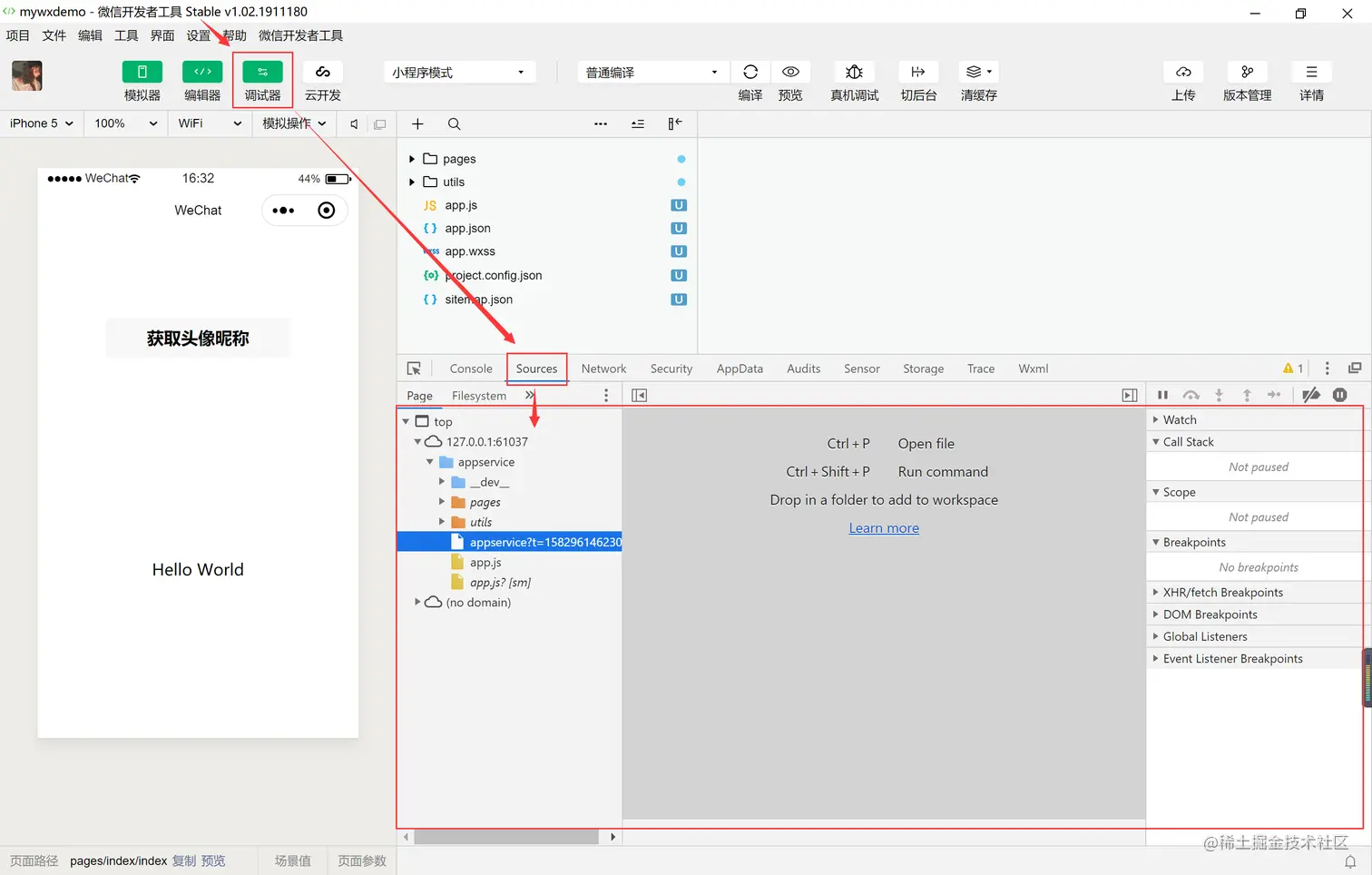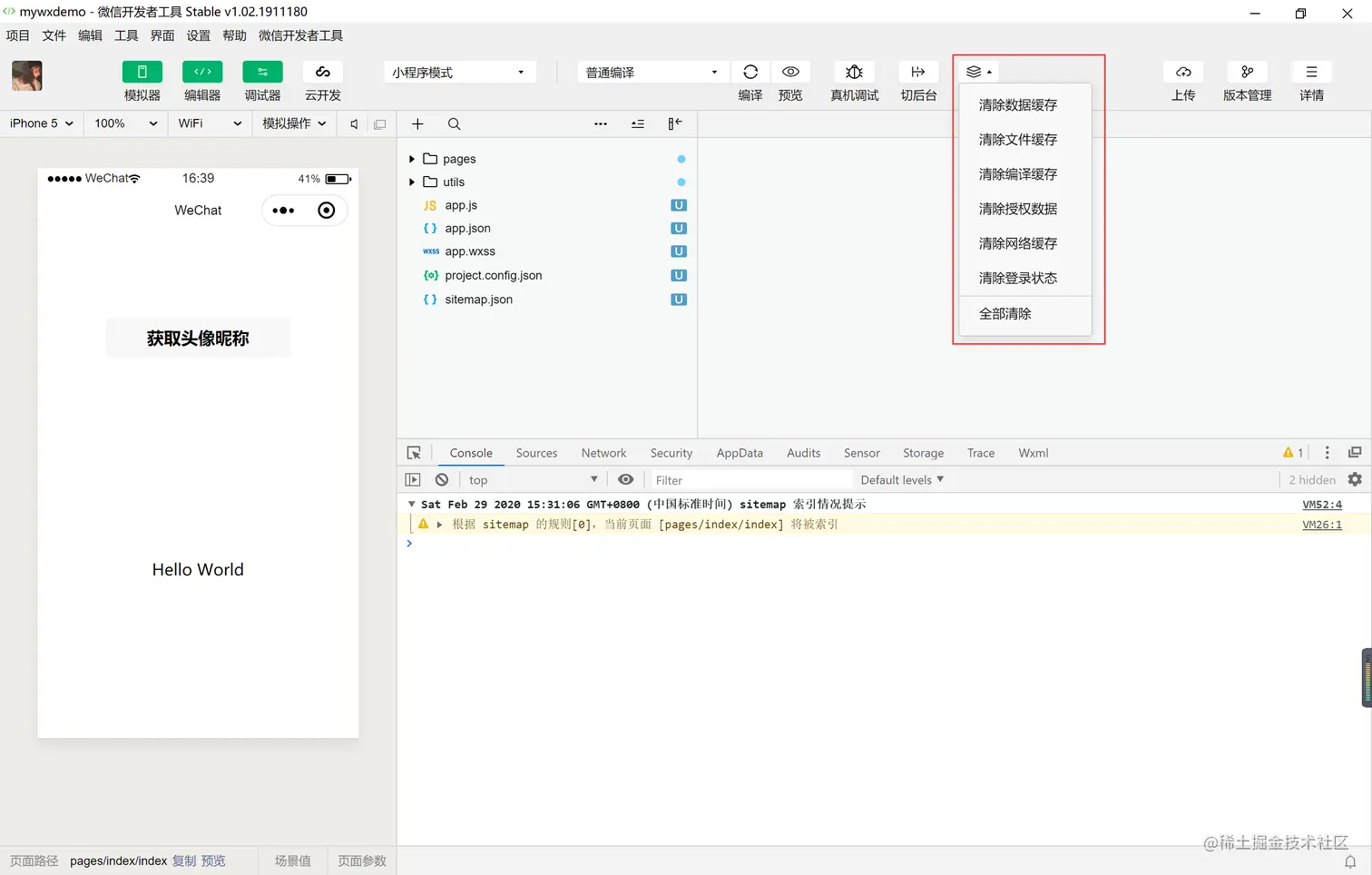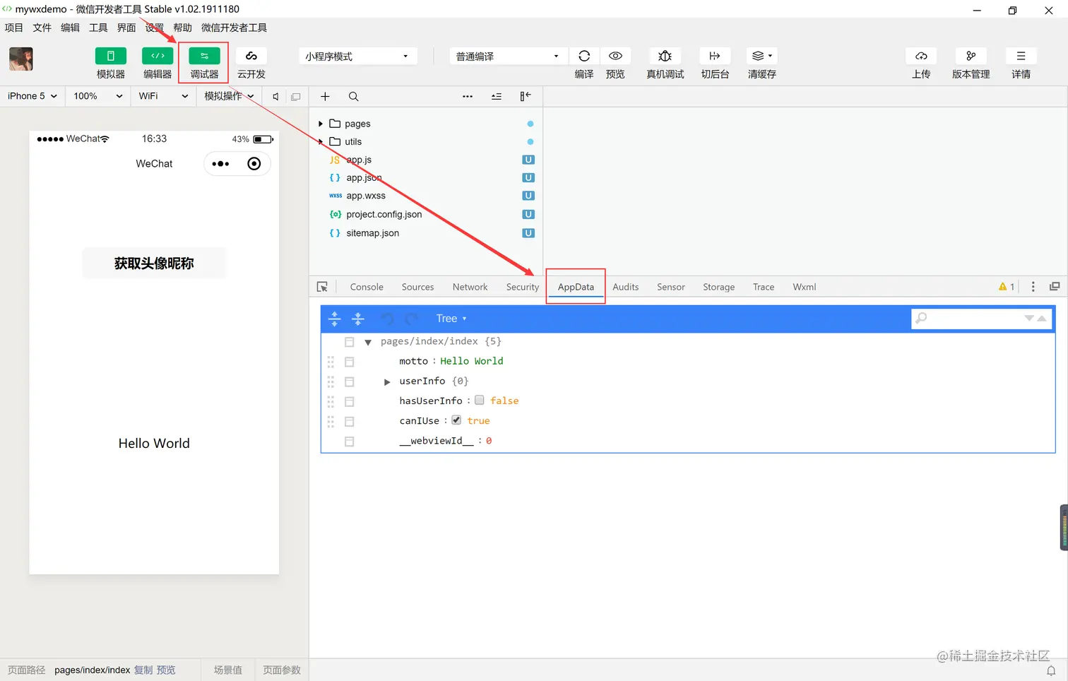 调试工具有Console、Sources、NetWork、Storage、AppData、Wxml。