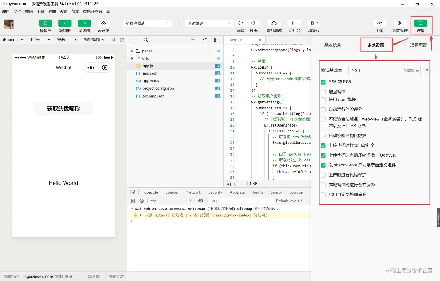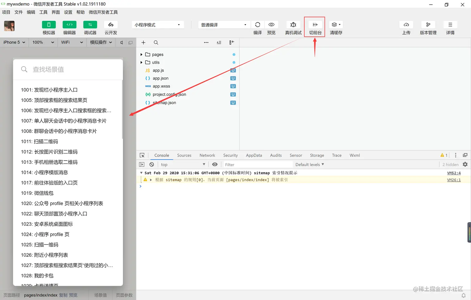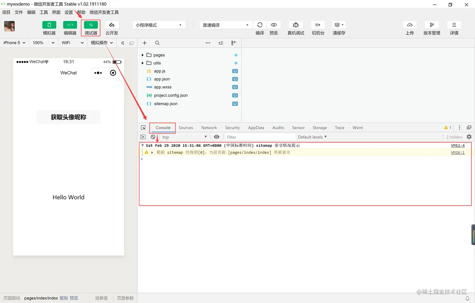 【1】Console 用于显示微信小程序的输出出错信息和代码错误信息.如下图所示: