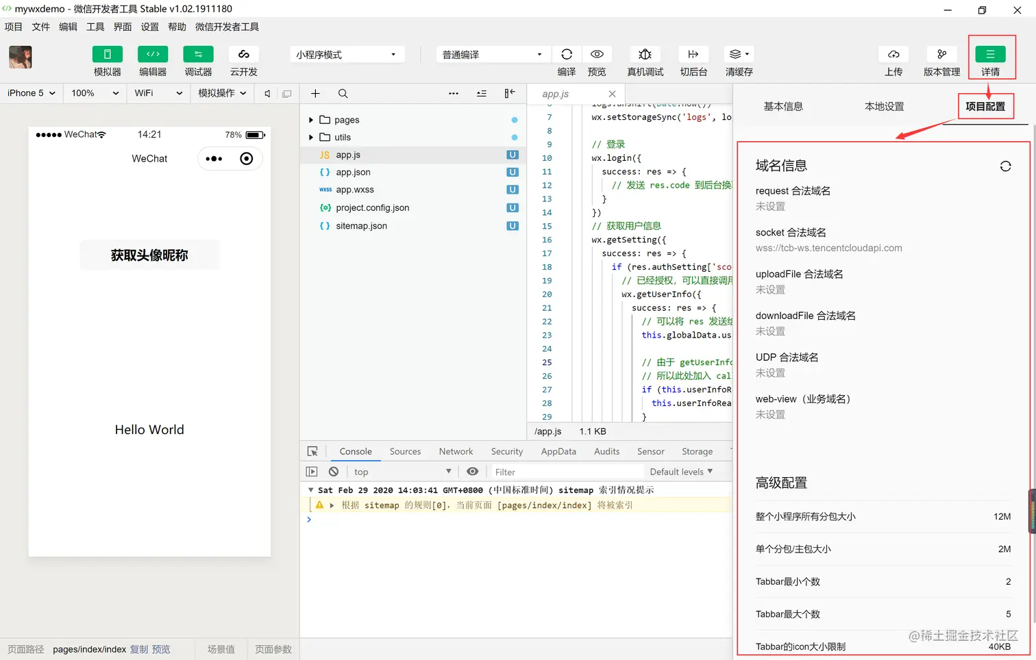 可以在项目配置中查询到域名信息以及高级配置信息。如下图所示: