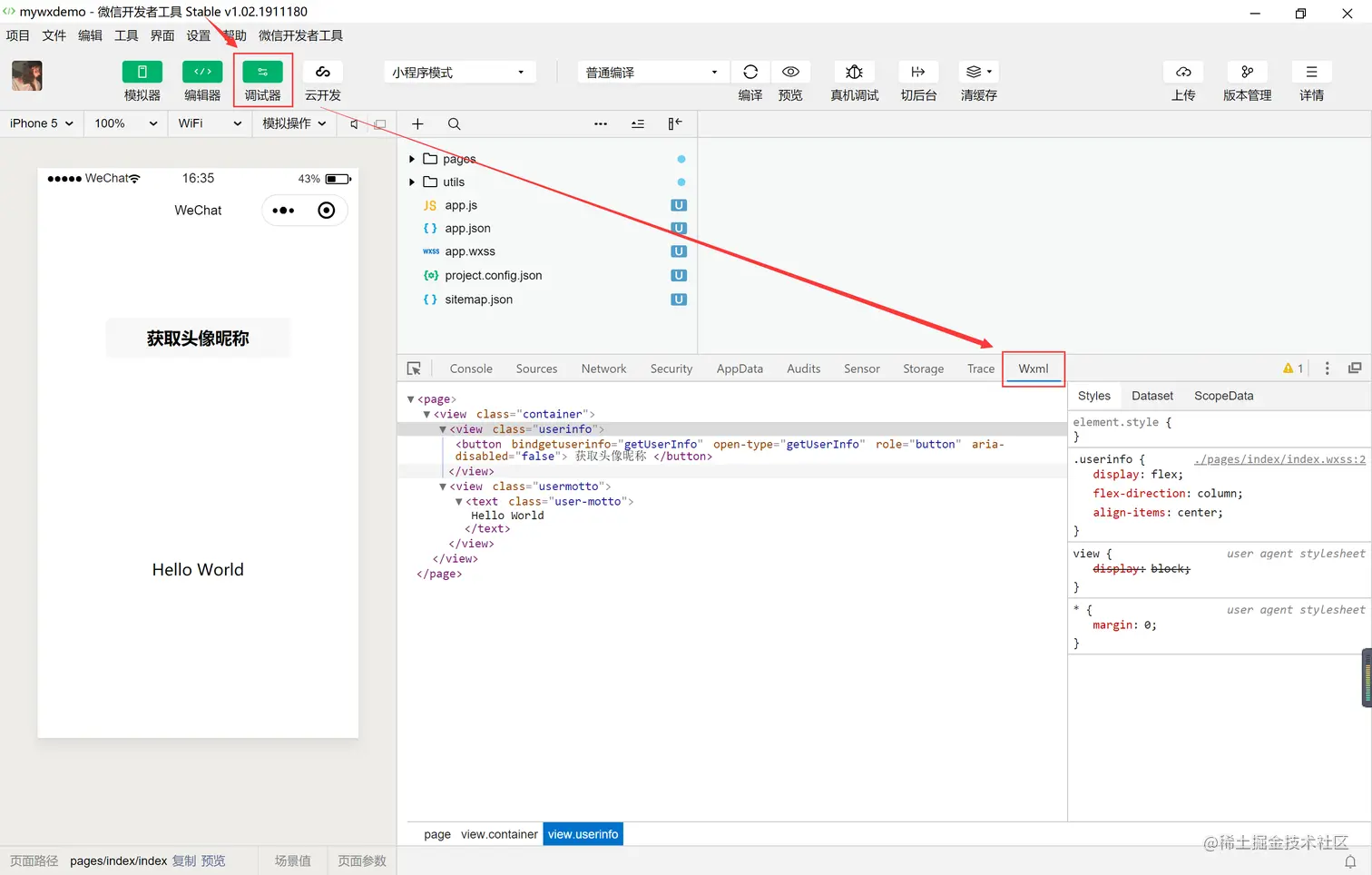 【6】Wxml 用于帮助开发者开发wxml转换后地界面。同时,这里可以实时的看到真实的页面结构以及结构对应的wxss属性,同时可以修改对应wxss属性。如下图所示: