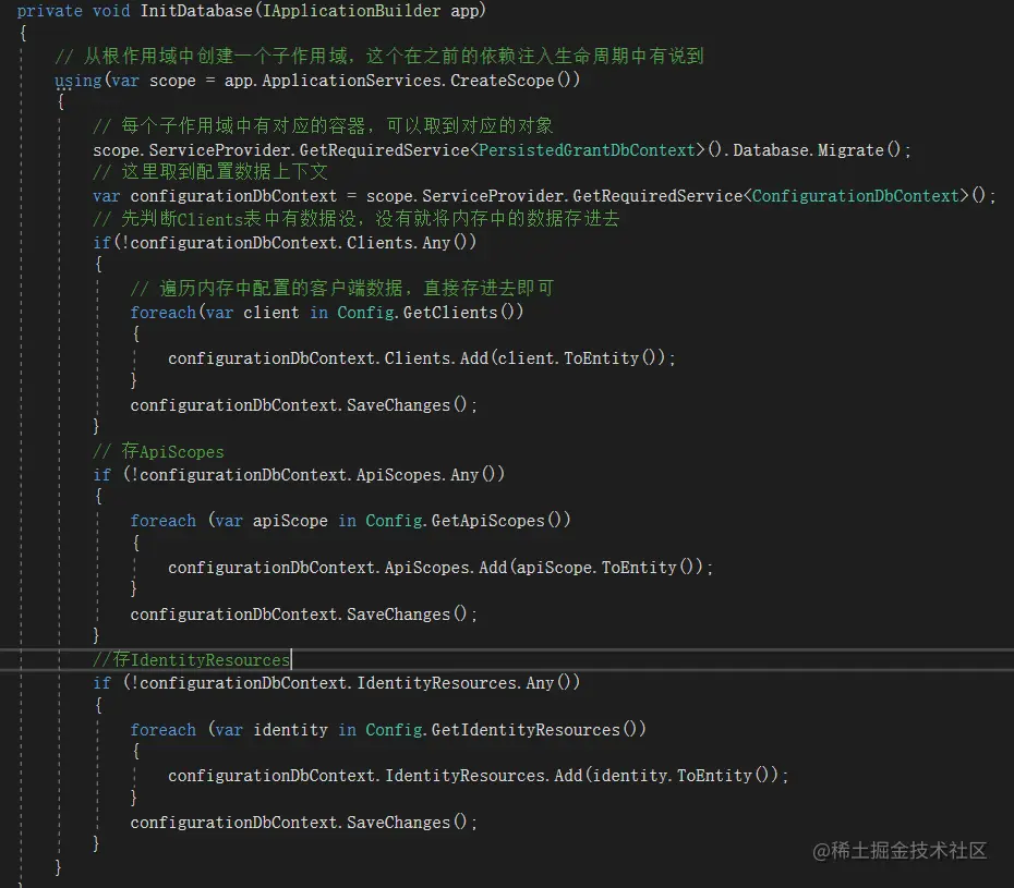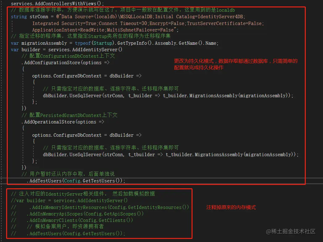 然后在Startup.cs文件中,将原来的内存模式改为从数据库中读取即可;其实最关键的就是IdentityServer4封装好的两个上下文: