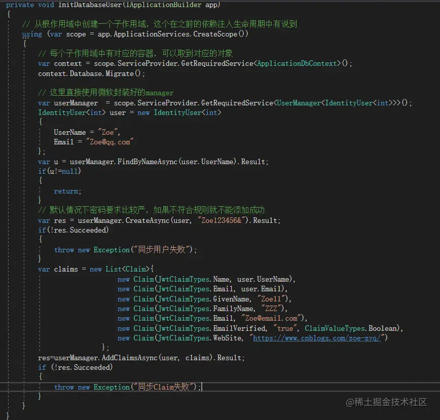 方法写好,同样在Configure中调用即可,种子数据准备好之后,就可以用Zoe用户进行登录啦,密码就是Zoe123456&
