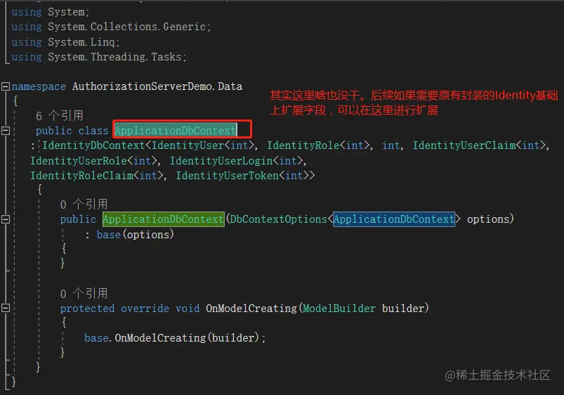 因为IdentityDbContext是抽象类,不能直接使用,这里需要针对IdentityDbContext定义一个子类ApplicationDbContext,如下: