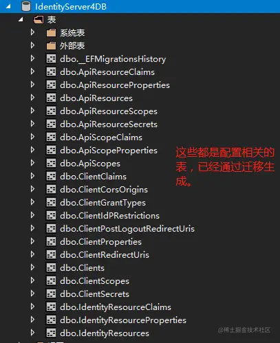 - ConfigurationDbContext:这个上下文主要是针对配置数据,比如客户端(Client)、资源(Resources)等;