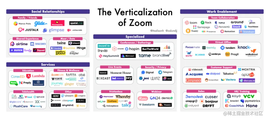 作为分析的一部分,他指出这些量身定制的初创公司事实上对Zoom构成的威胁甚至比任何一个直接竞争对手都大。Oslund认为专注于特定用户——-从班主任到项目同事再到游戏之夜的朋友的能力,为垂直领域的公司创造了一种完全适合其客户的独特优势。他认为"专注于垂直领域的创业公司设计的产品能更好地满足特定用户群的需求。这让他们能够创造和获取比Zoom这样的横向产品更多的价值。"(以下是他对Zoom垂直化的完整列表)。