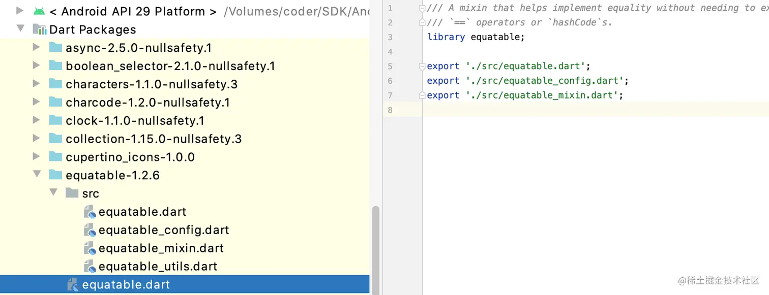 然后执行 Pub get ,你就可以在 Dart Packages 下看到 equatable 包。