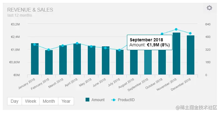 使用此功能可以将数据的年度视图从年度视图切换到每月,每周或每天,而无需更改整个数据大屏上显示的时间段。如果要真正快速更改单个图表的时间间隔而又不影响数据大屏上的其他数据可视化效果,这将特别有用。