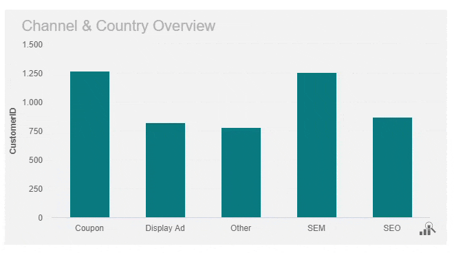 如在上图示例中我们可以看到的,按选定国家/地区的渠道查看客户数量的表现。
