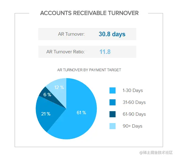 这个财务图表也是以可扫描的饼图形式来展现,并附有重要的营业额指标,该财务图表量化了企业如何迅速收取欠款,从而展现了你在扩展信贷方面的优势。