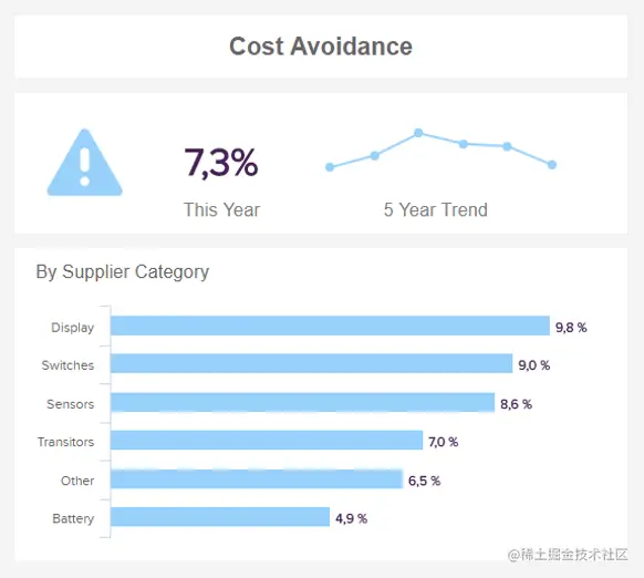 如果不避免成本,财务数据可视化示例将是不完整的;这是重要的图表之一,因为它可以跟踪在特定时间范围内节省了多少采购部门成本(在这种情况下,是采购部门的成本)。