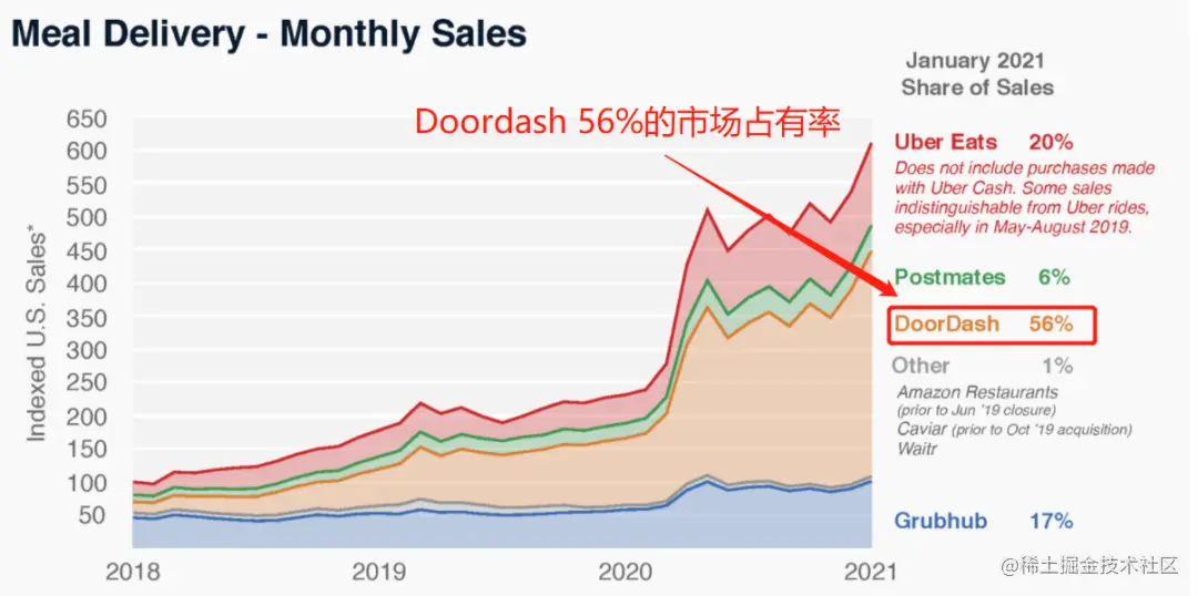Doordash是华人创立的外卖公司,在美国外卖配送行业占比最大,拿下了56%的市场占有率,抢占了美国外卖市场几乎一半的江山!
