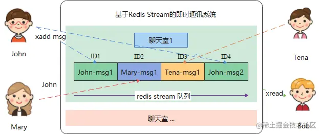 以即时通讯中的聊天室场景为例,使用Redis Stream作为中间件,实现聊天室的发言以及信息查看。