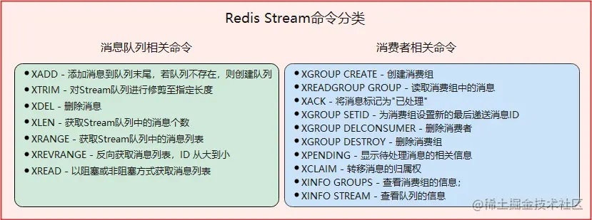 Redis Stream命令可以分为消息队列命令和消费者命令两类,如下所示: