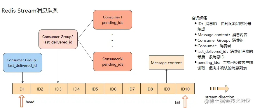 与Pub/Sub相比,Redis Stream 具有消息的落地存储功能,每一个客户端能访问任意时刻的消息,并且能记录每一个客户端的访问位置,还能保证消息不会丢失。Redis Stream 的结构如下所示,它有一个消息链表,将所有加入的消息都链接起来,每个消息都有唯一的 ID 和对应的内容。