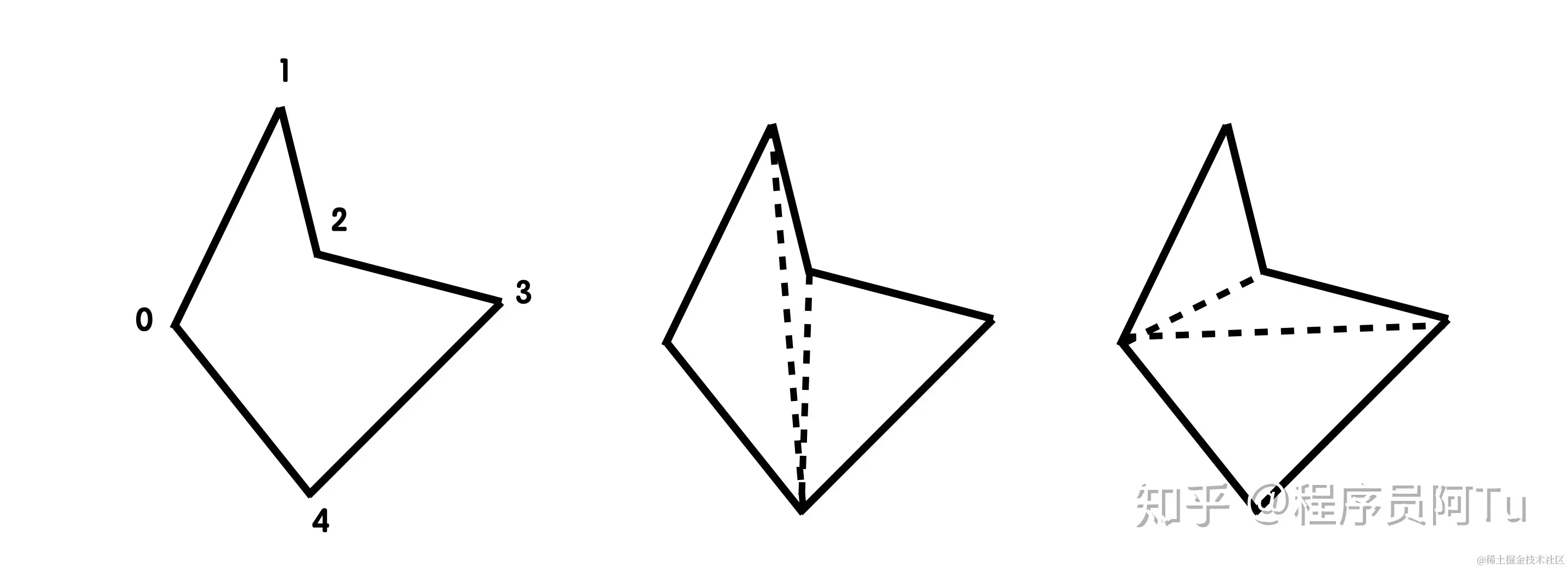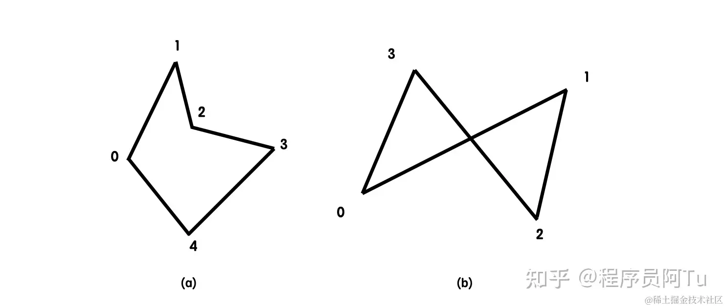 三角剖分在使用时有一个前置条件:使用对象必须为简单多边形,即多边形中的任何两条边仅可以在顶点处相交。下图(a)多边形为满足定义的简单多边形,图(b)多边形边01和23在非顶点处相交,因此是非简单多边形。