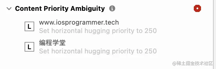 我们可以看到“www.iosprogrammer.tech“所在label所占的空间变大了。此时设置这个label的Content Hugging Priorities为750。