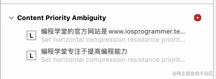 现在两个UILabel里面文字内容所占大小加上3个水平约束的值仍然小于(<)父视图的宽度。此时会发现storyboard中有报错,但是我们仍然可以正常运行项目并看到展示结果。
