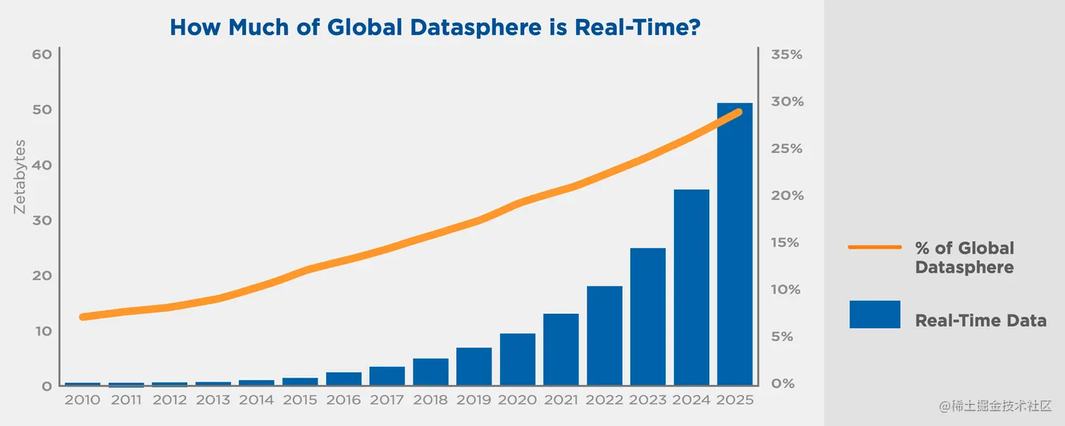 根据国际知名分析机构 IDC 的研究报告1, 这种实时的流式数据占总体数据规模的比例正不断攀升,预计 2025 年能达到 30%。