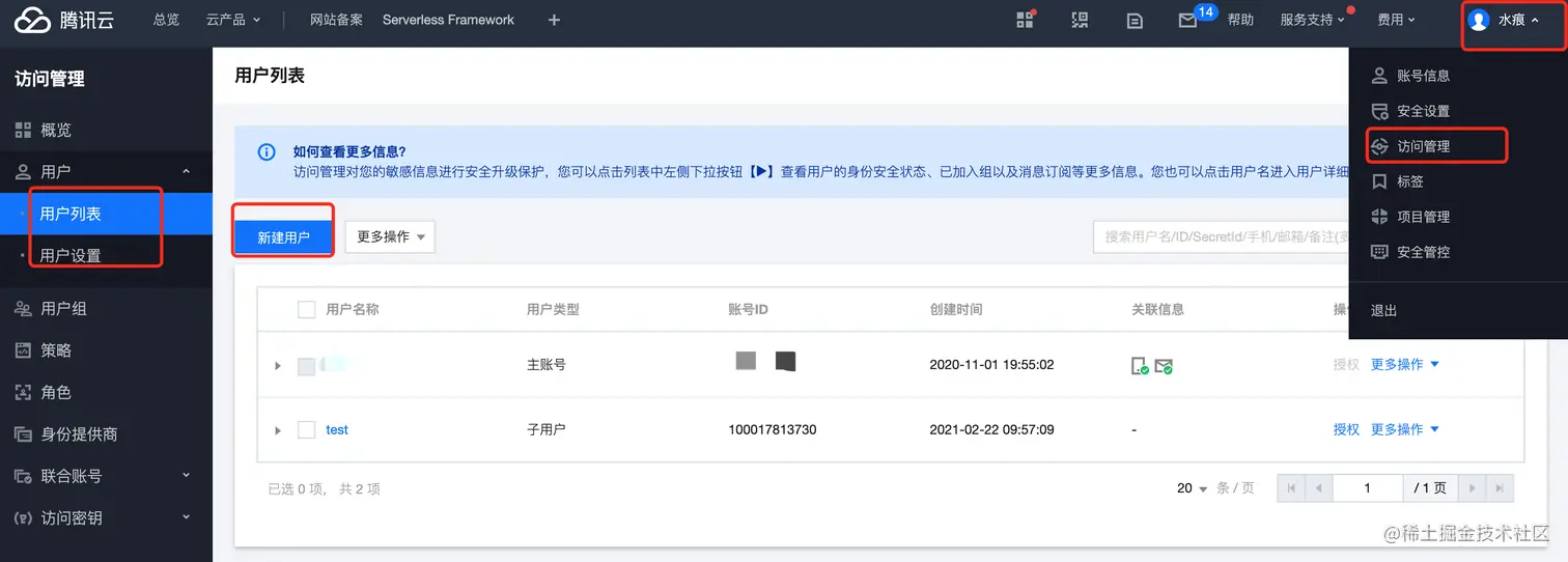 secretId和secretKey的获取方式需要创建一个子用户