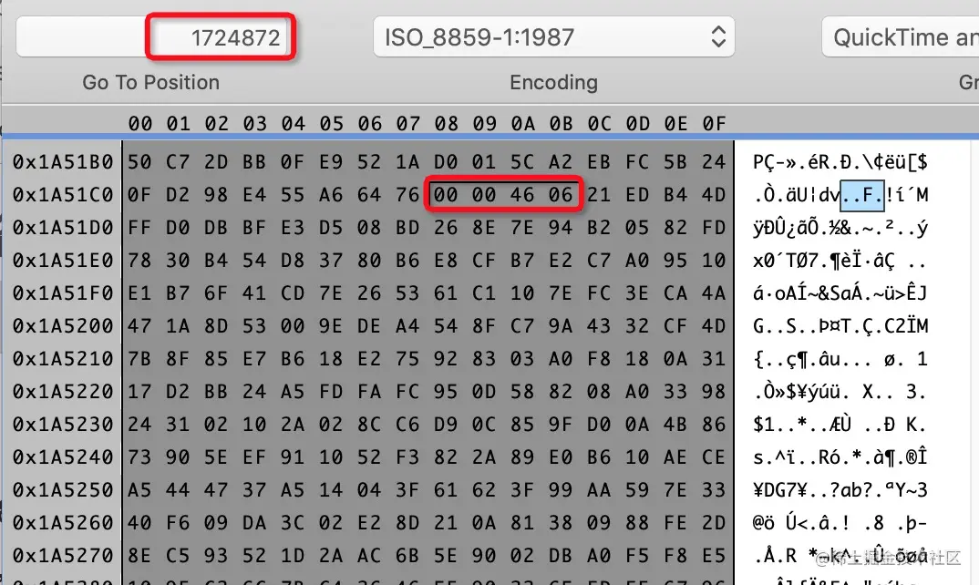 - 验证:用编辑器打开 MP4 文件,定位到文件偏移 offset = 1724872 的位置,前 4 字节值为 0x00004606。在 avcc 中一个 Sample 的前 4 个字节代表这个包的大小,转换为十进制是 17926,该值正好等于 size = 17930 减去表示长度的四个字节。