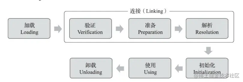 类的加载一共是7个过程,分别是加载、验证、准备、解析、初始化、使用和卸载,不知道大家还记不记得对象创建的7个过程呢?这两个可以放一起来记。