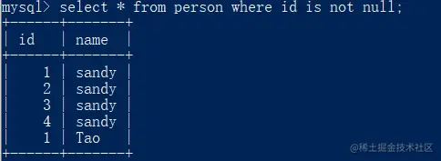 select * from person where id is not null;