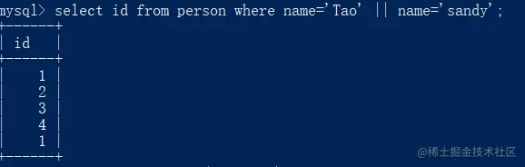 select id from person where name='Tao' || name='sandy';