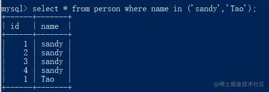 select * from person where name in ('sandy','Tao');