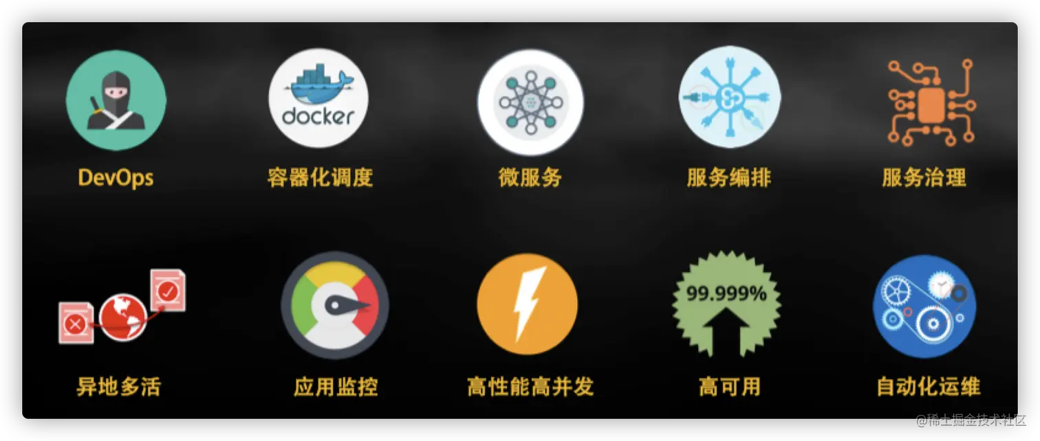 - 基于容器的敏捷基础设施。容器的意义在于相对于物理机性能损失不大的情况下,为我们提供了标准化的运行环境,能够把复杂的配置封装到镜像中。特别是在微服务架构中,服务数量较多,上线频繁,为了保证高可用,需要轻量级的隔离机制,当流量变化时,需要快速伸缩。