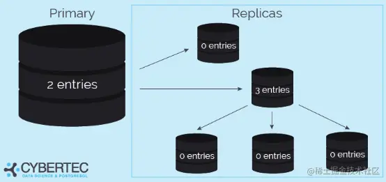 人们经常说 pg_stat_replication视图是primary端的,这是不对的。该视图的作用是揭示有关wal sender进程的信息。换句话说:如果你正在运行级联复制,该视图意味着在secondary复制到其他slaves的时候, secondary端的 pg_stat_replication上的也会显示entries(条目),以下图来说明该场景: