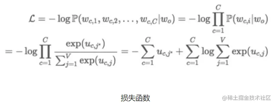 由于我们想在第c个上下文位置预测w(c, j) 时实现概率最大化,可以使用损失函数L。