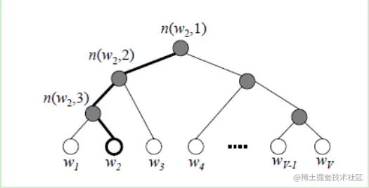 由于我们把之前所有都要计算的从输出softmax层的概率计算变成了一颗二叉霍夫曼树,那么我们的softmax概率计算只需要沿着树形结构进行就可以了。如下图所示,我们可以沿着霍夫曼树从根节点一直走到我们的叶子节点的词w2。