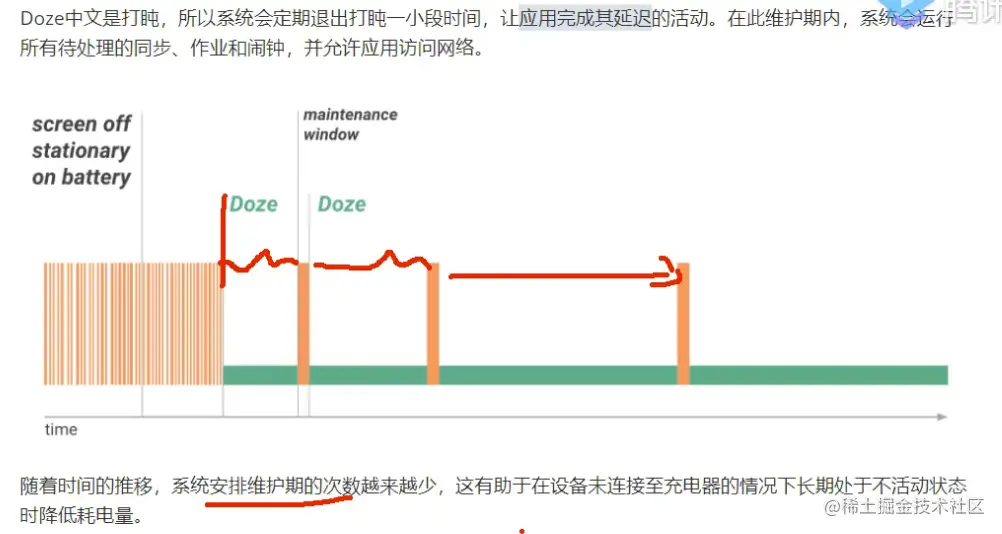 Doze系统会定期退出打盹一小段时间,让应用完成其延迟的活动