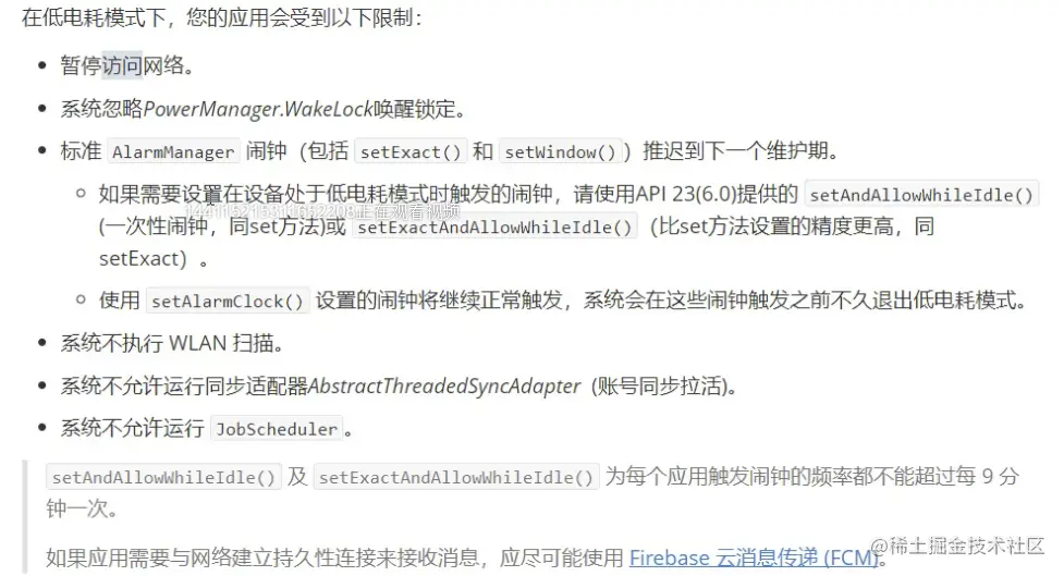 系统提供了一个可配置的白名单,在低耗电模式和应用待机模式期间,列入白名单的应用可以使用网络并保留部分唤醒功能