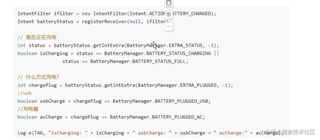 为了减少电量消耗,我们可以通过检查电池状态以及电量来判断是否进行某些操作,比如在充电的时候上报crash日志。