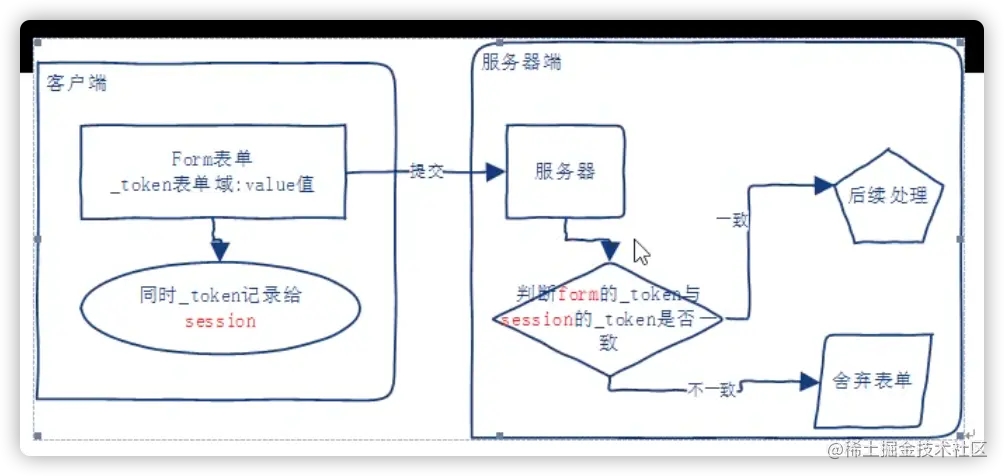 例如:通过另外一台未授权服务器访问我们的服务器,如果是恶意攻击会很尴尬,所以可以通过去服务器获取页面回来的时候,附带一个令牌,前端显示页面之后,有访问操作的时候需要将令牌带回服务器验证比较。