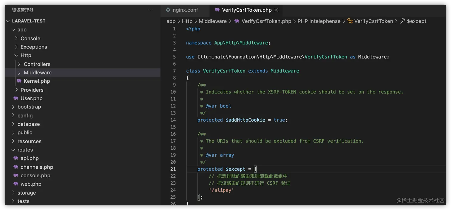 三、Laravel 框架如何排除指定路由不进行 CSRF 验证
