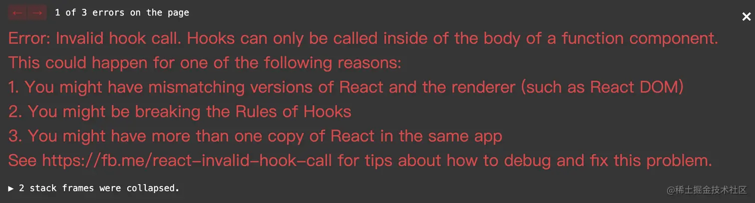这种方案会将我们开发目录下的所有文件(包括node_modules)都链接到我们的测试目录,这样就有可能造成依赖冲突的问题,例如下面这个比较常见的 React 版本冲突的问题。