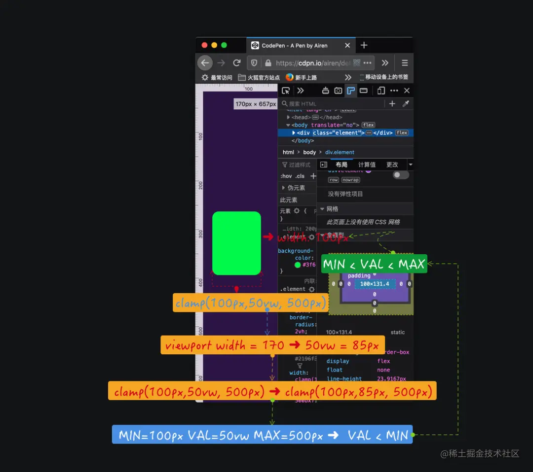 这个时候.element元素的width是100px。此时,clamp(100px, 50vw, 500px)相当于clamp(100px, 85px, 500px),对应的VAL值是85px,该值小于MIN值(100px),那么这个时候clamp()函数返回的值是MIN,即100px,这个时候.element的width值就是100px(即MIN的值)。