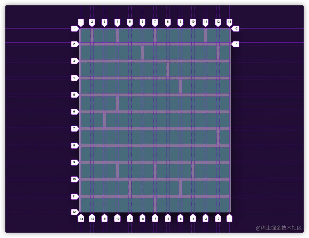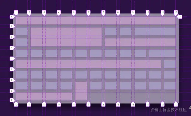 就该示例而言,grid-template-columns: repeat(12, 1fr)创建网格如下图所示: